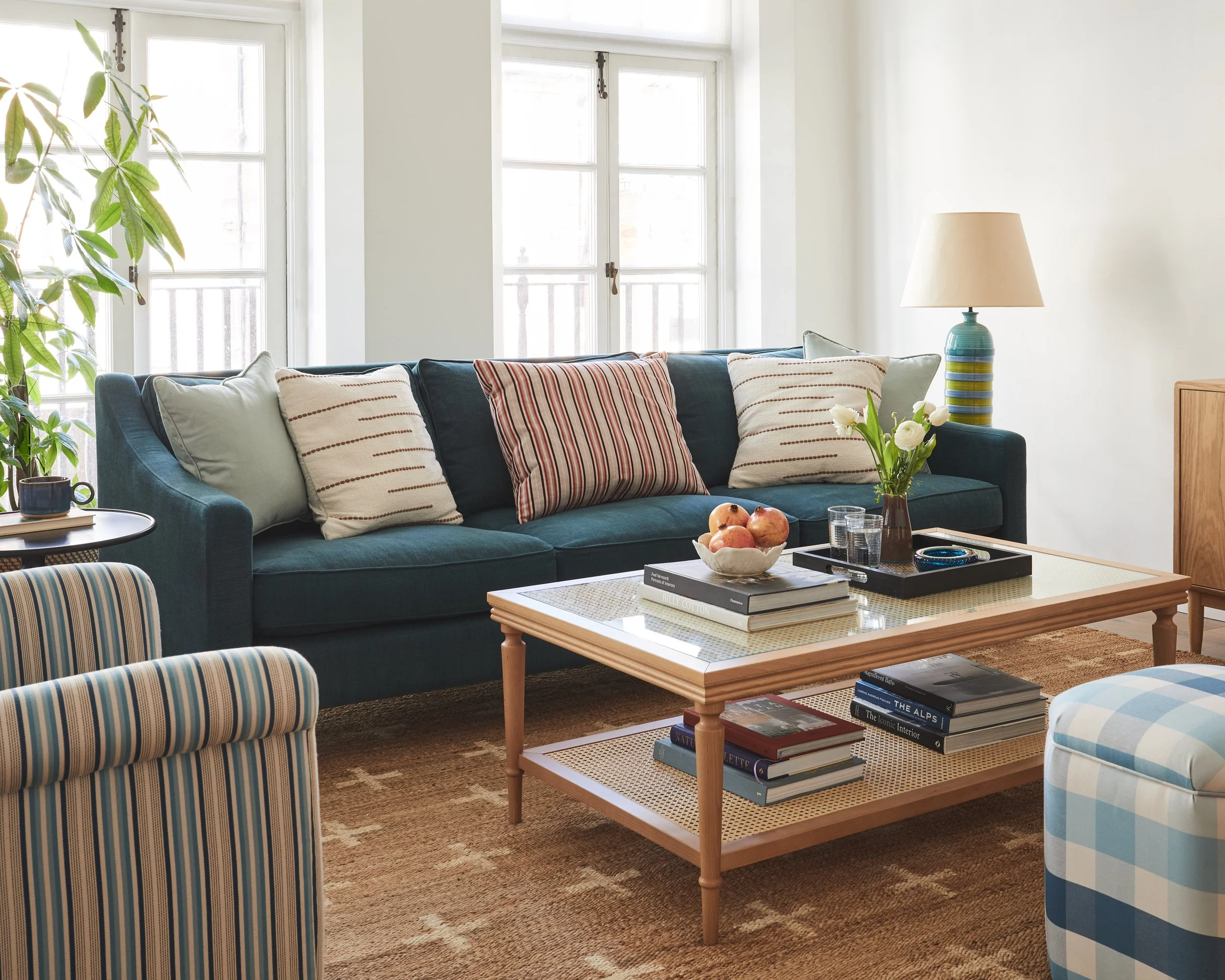 Consider the vibe – is it a family room that is more casual? Then you can look at suitable furniture, an L-shape sofa for example. Or is it a formal room for grown-up entertaining? Then a symmetrical layout might work better and with a more tailored-style of furniture. If you may need to host large numbers, think about how you can add furniture that will double as tables and seats e.g. upholstered ottomans, benches.