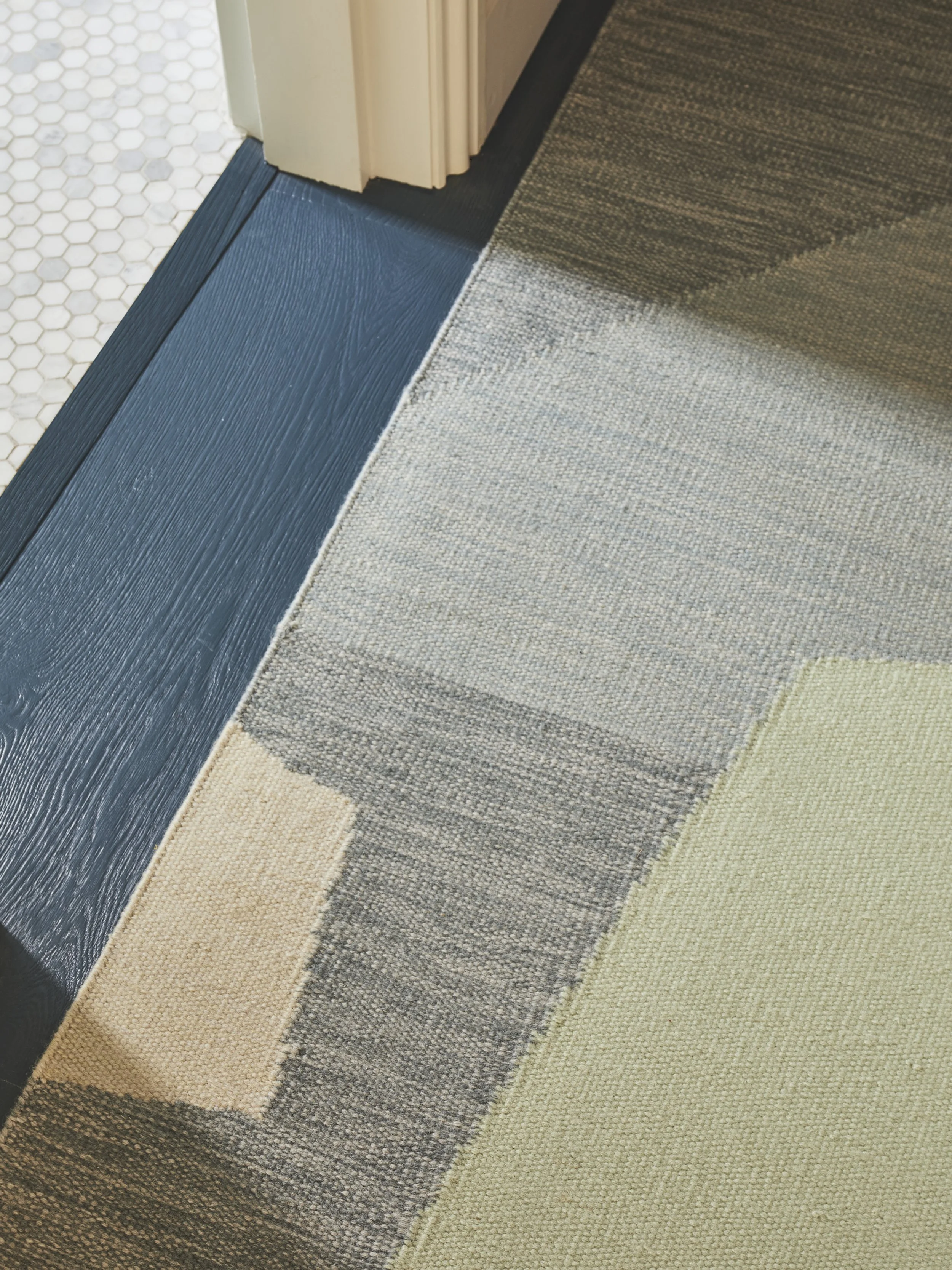 Uninteresting grey timber floor was painted in F&B's Hague Blue throughout, grounding the schemes in a colourful property in South West London.