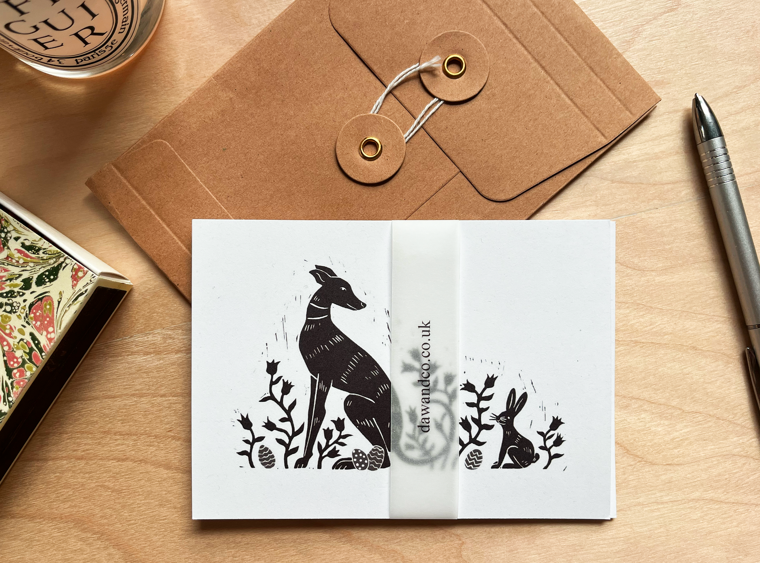 Inspired by my beloved whippet, Albert, who is chief rug and furniture tester here at Daw&Co, we commissioned a series of lino cut illustrations to celebrate him. The original artwork was by up-and-coming creative talent, Eve Dickson. There is a whippet for all seasons - Spring, Summer, Autumn and Winter, which you may have seen posted on Instagram at Easter, during the summer holidays, at Halloween and at Christmas. We loved them so much that we are making them available as a set of 4 postcards to buy from our shop.